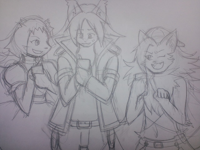 うちの子がついったーしたらタグに触発されて、オリトロボ主人公組にスマフォを使わせてみたの図。左からシャルロット、ロート君、クランセ。